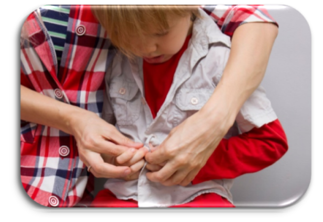 - Ensure that your child is sitting in a stable position, preferably on a chair with their feet supported when fastening or unfastening zips or buttons (off the body).
